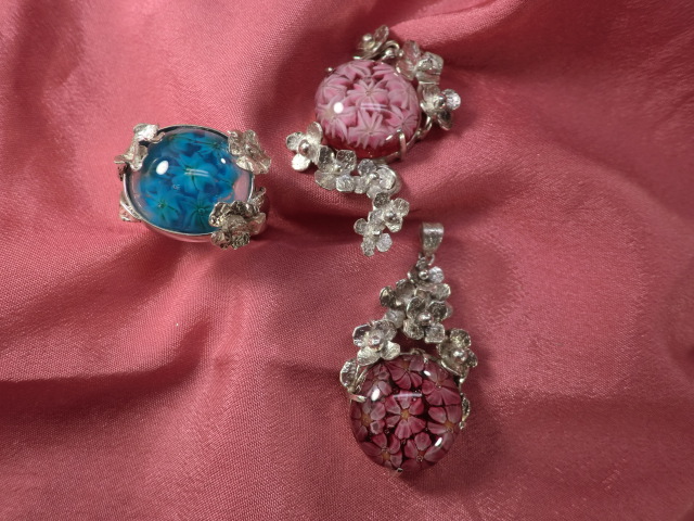 ほとんどなんですが今回はトンボ玉というガラスを使ってみました。 トンボ玉は透けて見える柄が気に入った、「花玉屋」さんにお願いして 作っていただきました。 また、トンボ玉は一般的には球形なんですが、アクセサリーとして使うときには 高さが高くなってしまうので半円に加工していただき 通常使っている天然石のカボションカットのように爪止めをしています。 このトンボ玉の柄を見た時からまわりの装飾には花の模様が 似合うのではないかと思い周りに花を咲かせてみました。 ガラスの柄とまわりの花の装飾が良い具合にマッチして。 華やかなペンダントに仕上がりました。 PR