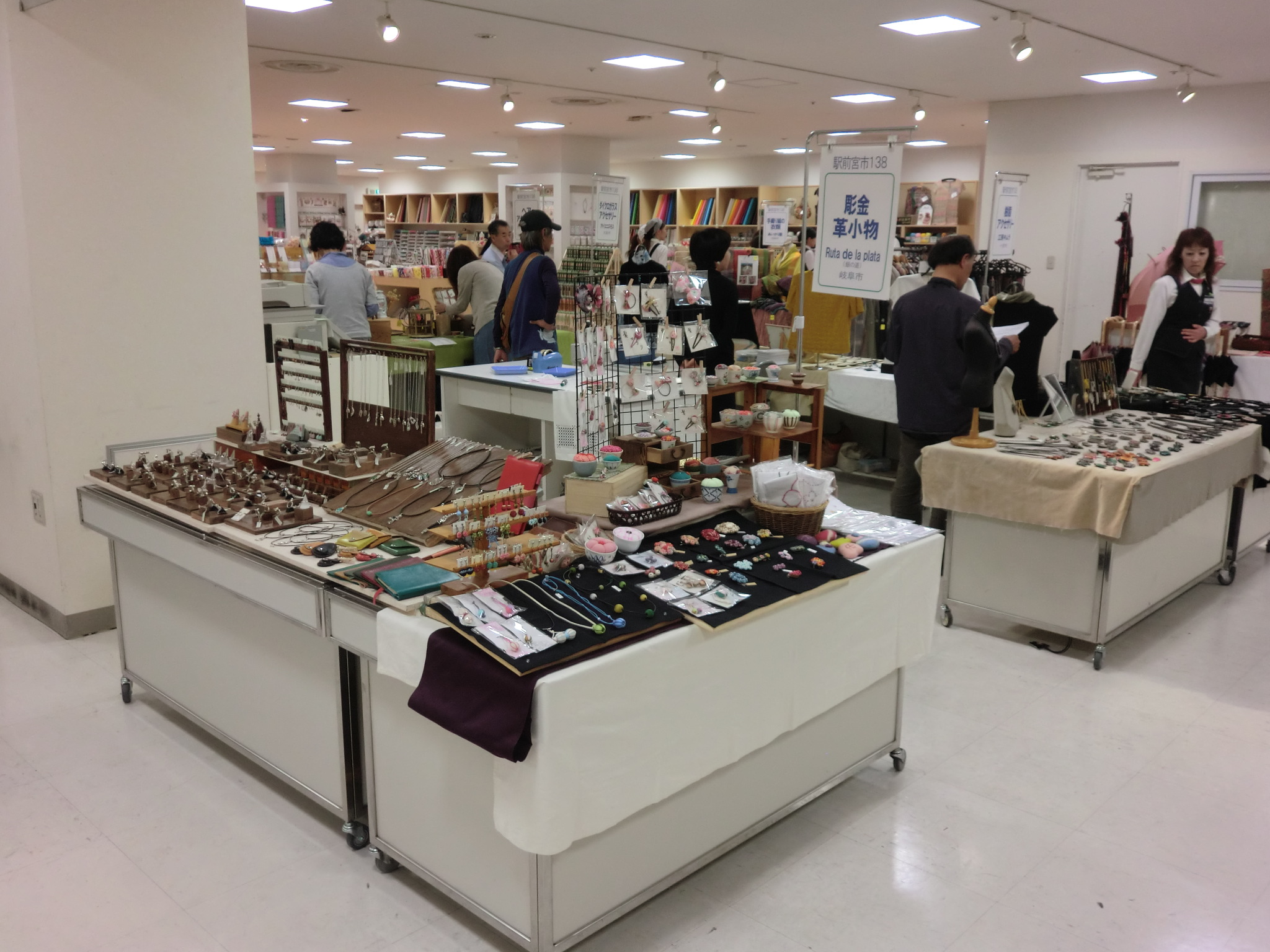 エキマエ宮市138 (杜の宮市 IN 名鉄百貨店一宮店 ) が開催されそこに参加してきました。 きのう真清田神社で一緒だった作家さんや、またエキマエ宮市だけに参加の作家さんが 約40人ぐらい集まりました。 6階催事場で同じ展示台の高さで、整然と並んだブースは屋外のクラフト展とは また違う趣がありました。 銀の道のコーナーにはきのうブースがせまくて並べられなかった 花 の作品も全て並べました。 いつもの各ブースごとのオリジナリティー あふれた展示も良いんですが、こんな風に ある程度規格化されたブース風景も見慣れていないだけに 新鮮な感じがします。 今回この会場でお立ち寄りいただいたお客様のなかにはクラフト展にあまり行かれない方も いらっしゃいました。そんなお客様との会話からいつもと違う目線でみた銀の道の作品 の感想などを頂戴できたのも貴重な経験になりました。 銀の道のコーナーにお立ち寄りいただたお客様、またお買い上げいただいたお客様 本当にありがとうございました。 PR