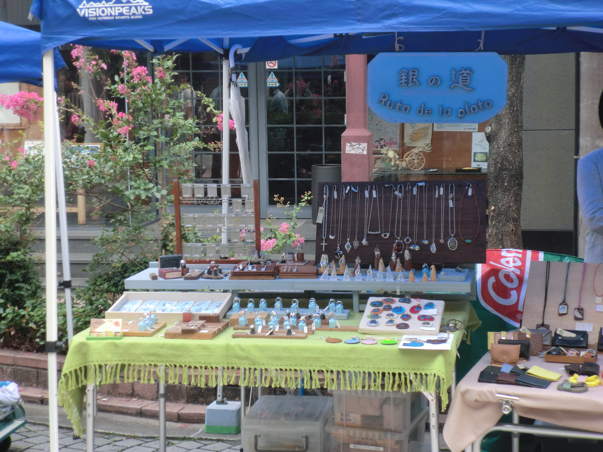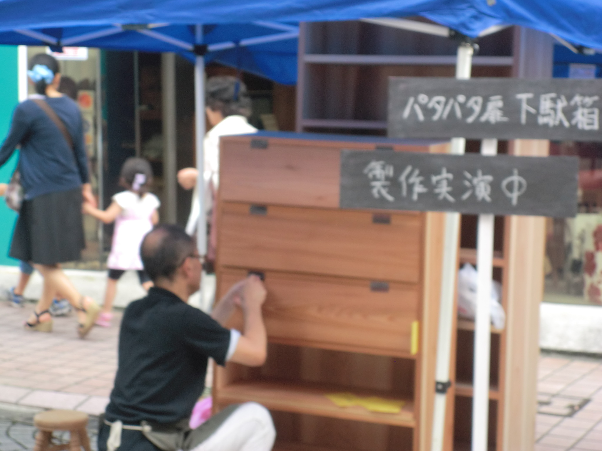 約20ぐらいの出展数でしたが、結構個性的なものが多く ユニークな発想が面白く他の作家さんとの話も弾み 5時間という時間がとても短く感じられました。 また、お客様もゆっくりと作品を見て、作家さんとの会話も含めて つくる市の時間を充分楽しまれている様子でした。 美殿町商店街を通行止めにして会場にしています。 2.5mのブースサイズでしたが、あいにく2.0mのタープしか持ち合わせがないため いつもよりコンパクトに展示しています。 週末かけて作った展示用品も初のお目見え、出来栄えはともかく 機能性と重さに関しては以前よりよくなっていると思います!? ワークショップや製作実演も行われていましたが、上の画像のようなユニークな 制作実演も・・・・・ ついしばらく見入ってしまいました。 こんなのが結構好みなんです。