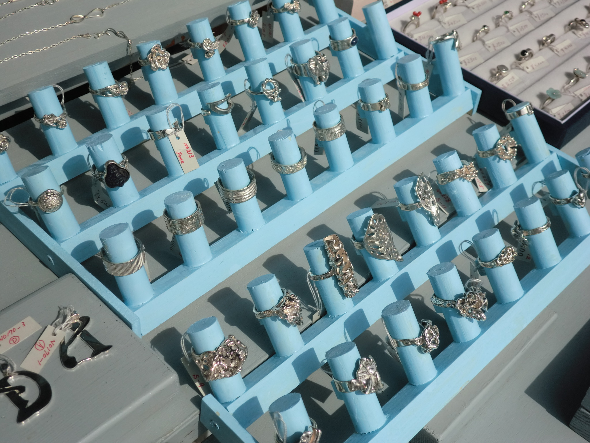 準備中からパラパラと小雨が、タープで雨をガードしながら 準備するうちにいつの間にか雨も止んでほっとする暇も無く 大急ぎで開店準備。 今回はいつもの展示台ではありません。 普通のテーブルのうえに平らに並べて見ました。 お客様の作品を見るときの見易さ、また視線の動きなど違いを把握して 狭いブースの場合どんな風に展示するのが一番効果的なのか知りたかったからです。 結果は? !!!!!! こんな感じでした。 太陽が雲にさえぎられると少し肌寒さを感じる一日でしたが、 お客様はこんなに沢山いらしていただけました。 ほぼ開催時間中は人の流れが途切れることはありませんでした。 今回のお隣さんは? 皆さんもう気がついていらっしゃるかと思うんですが、 このごろはお隣と言っても結構離れているんです。 犬山でシルバーアクセサリーとガラス雑貨を作っている 『 しるばーまーち 』 の木元さんです。 初めてお会いしたのは数年前のナゴヤクリエーターズマーケットだったと記憶しています。 最初にお会いしたときも、ネコの作品の作り方がとてもに可愛らしくて ネコ好きなんだろうと感じたのが最初の印象でした。 いろんな表情のネコがいます。 並んでいる中での一番お気に入りのネコはときいてみると 次の二つを教えてくれました。 私もこのごろお客様からネコの作品をリクエストされることがあり、 何点か作っていますが、こんな表情のネコはなかなか作れないですね。 |