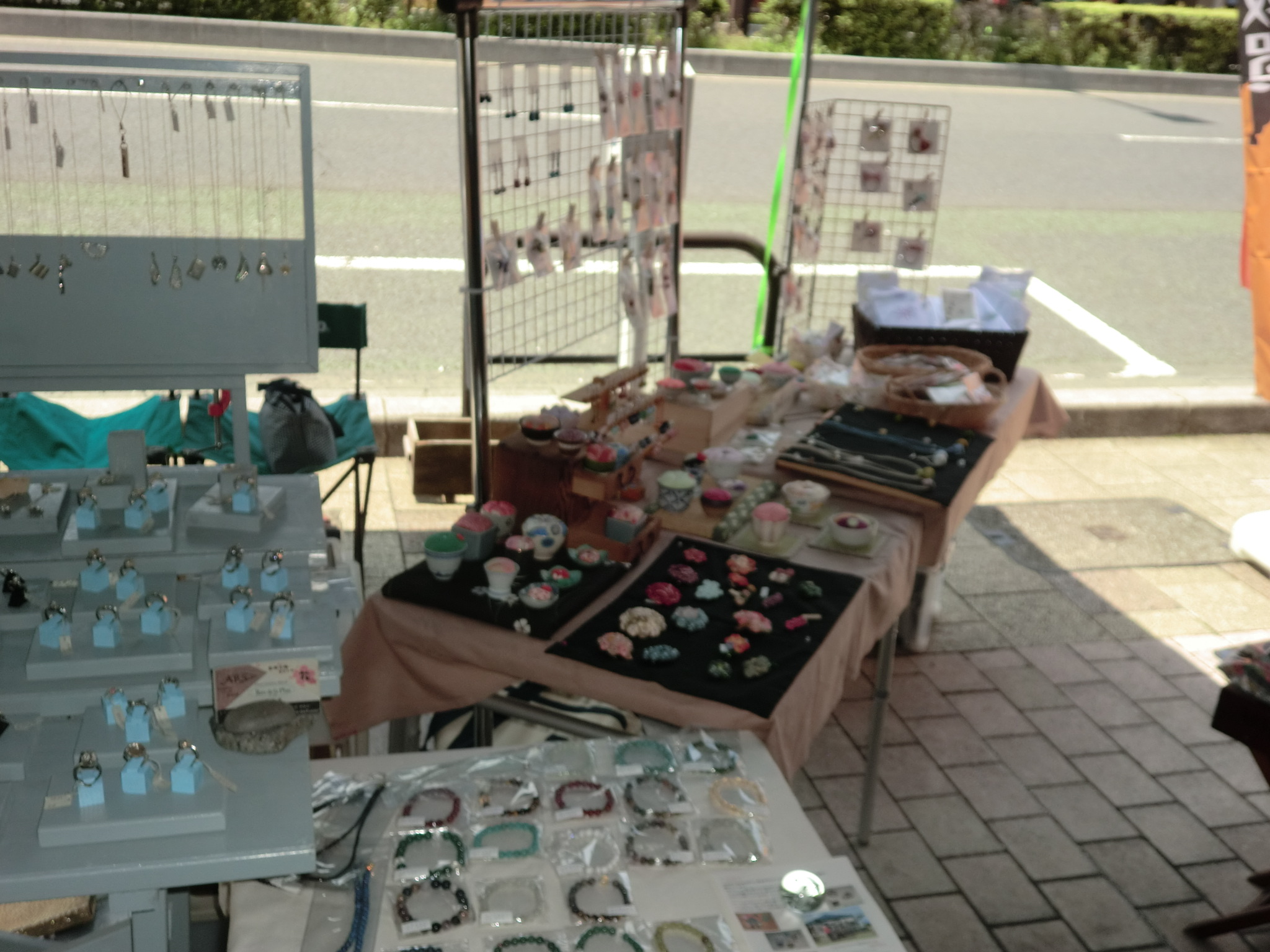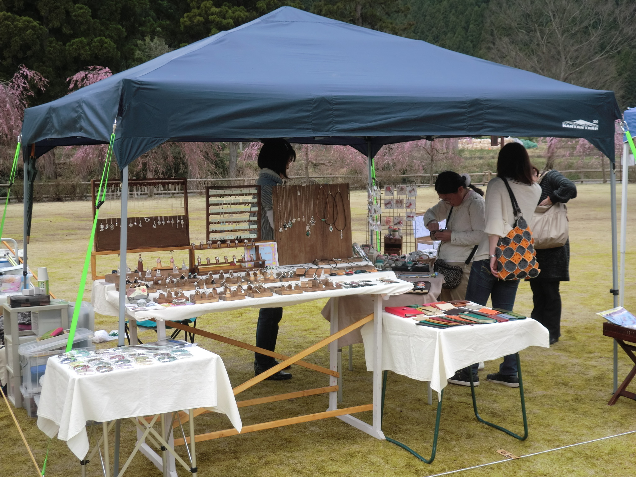 このおまつりに併設のクラフトフェアに出展するためです。 昨日行く前に≪出発します≫という文を時間指定でブログに書いたつもりが そのまま出てしまったようです。 たいへん失礼しました。 <m(_ _)m>の並木が来場者を迎えてくれます。 こんな桜が会場のたけくらべ広場全体に咲き乱れています。芝生の広場に広がった各ブースの回りもこんな風に桜の花に抱かれているようです。 銀の道のブースも天気の良い今日は大きくオープンにして店開きです。 桜見物のお客さんたちも朝から大勢いらっしゃっています。 山に四方を囲まれ、緑の山すそにはピンクのカーテンと本当に気持ちの良い会場です。 があり約20数店のお店からは色々おいしそうな 匂いがこちらのブースまで漂ってきます。 これはたこ焼き、こんどは焼き鳥とおなかがお昼まで 持ちそうにありません。 二日目は打って変わって夜半からひどい 風と 雨に見舞われました。朝の6時半過ぎに会場に到着し 自分のブースを見てみるとタープはしっかりと立って無事でした。 しかし中の展示台はブルーシートで雨の濡れない用にがっちりと覆っておいたにもかかわらず、 強い風にひっくり返っていろんな部分が損傷 して展示台として使用不能の状態になってしまいました。![]() このため今日これから風も雨も強まるという天気予報もあって展示を断念し、撤収作業を行い 7時半には会場を後にし岐路に着きました。 雨、雨、これだけ出展する土、日に雨が続くとラン、♪ ラン、♪、♪ と雨が大好きになります。 ダメです。脳が腐り始めて心にもないことを言いはじめました。 4月13日(金) 前日搬入、タープの設営をおわると雨がポツ、ポツと落ちてきました。 夜半の雨は翌日の14日になっても降り止まず、結局雨が上がったのは一日目の終了時刻の 16時過ぎでした。 銀の道のブースも雨が降りこむため、革も和布も並べることが出来ず銀作品だけの 展示になってしまいました。 雨と肌寒さのため、お客さんの数もあまり伸びません。 明日があるさとその夜は他の作家さんたちと自主的に交流会で盛り上がってしまいました。 ![]() 朝5時に目がさめ会場からは 朝日がこんなに明るく力強く、今日こそお客さんがたくさん来てくれますように。 も全部並んで見ていただけました。花の新しい作品の巻き玉のペンダントも 早速お買い上げ頂きました。 好みのクラフトブースに向かうお客様達。 やっぱりクラフト展は、明るいお日様 が欠かせません。 ![]() |