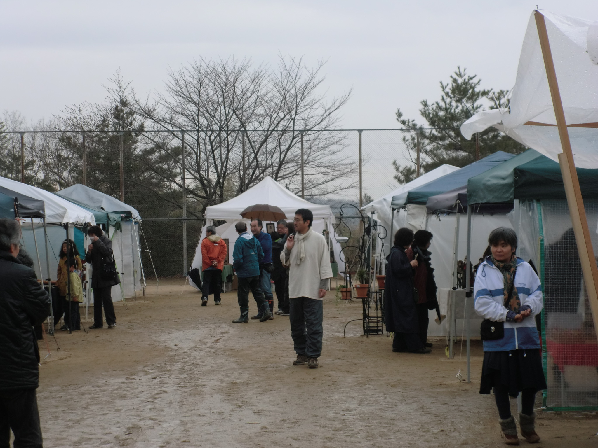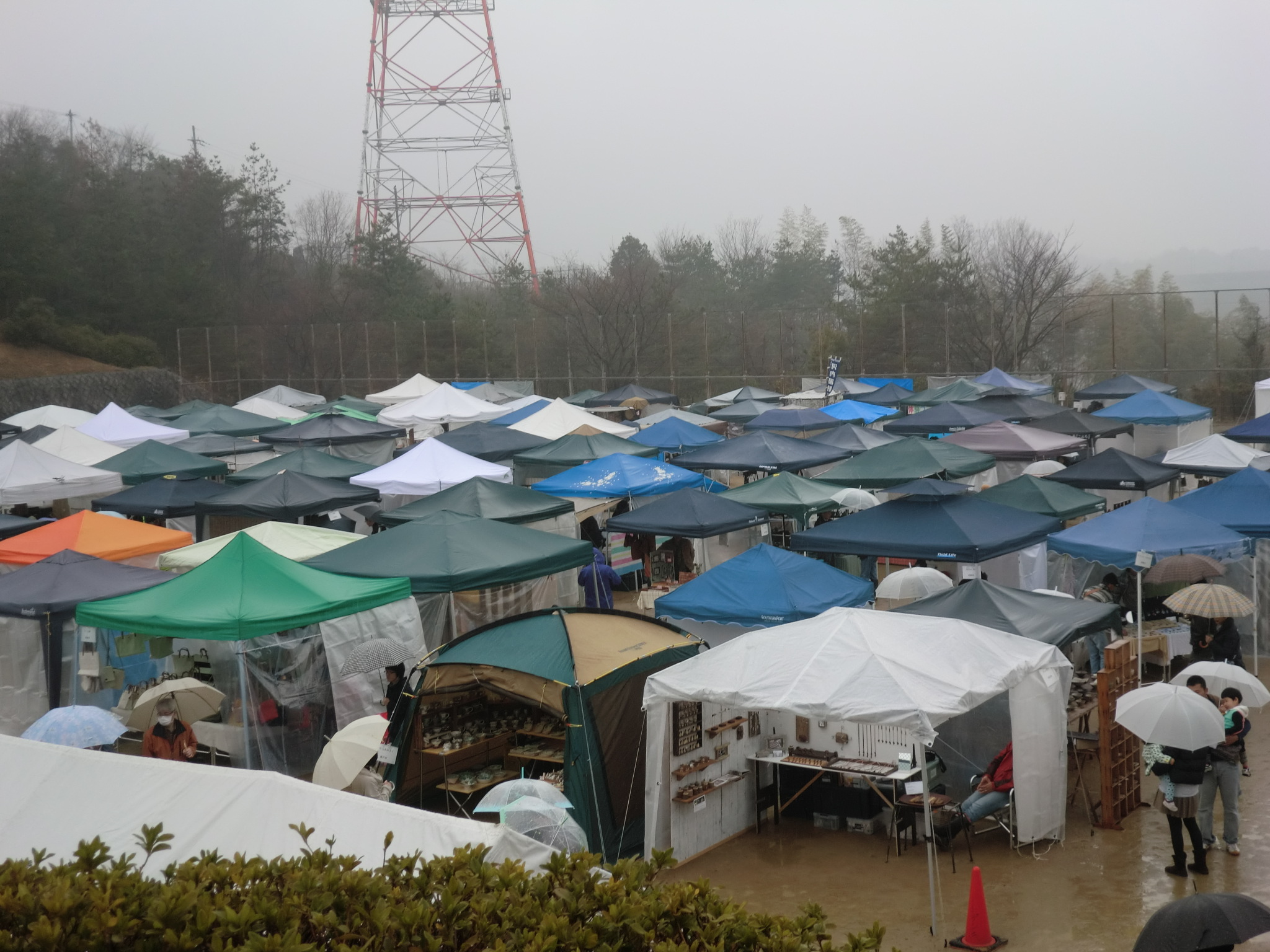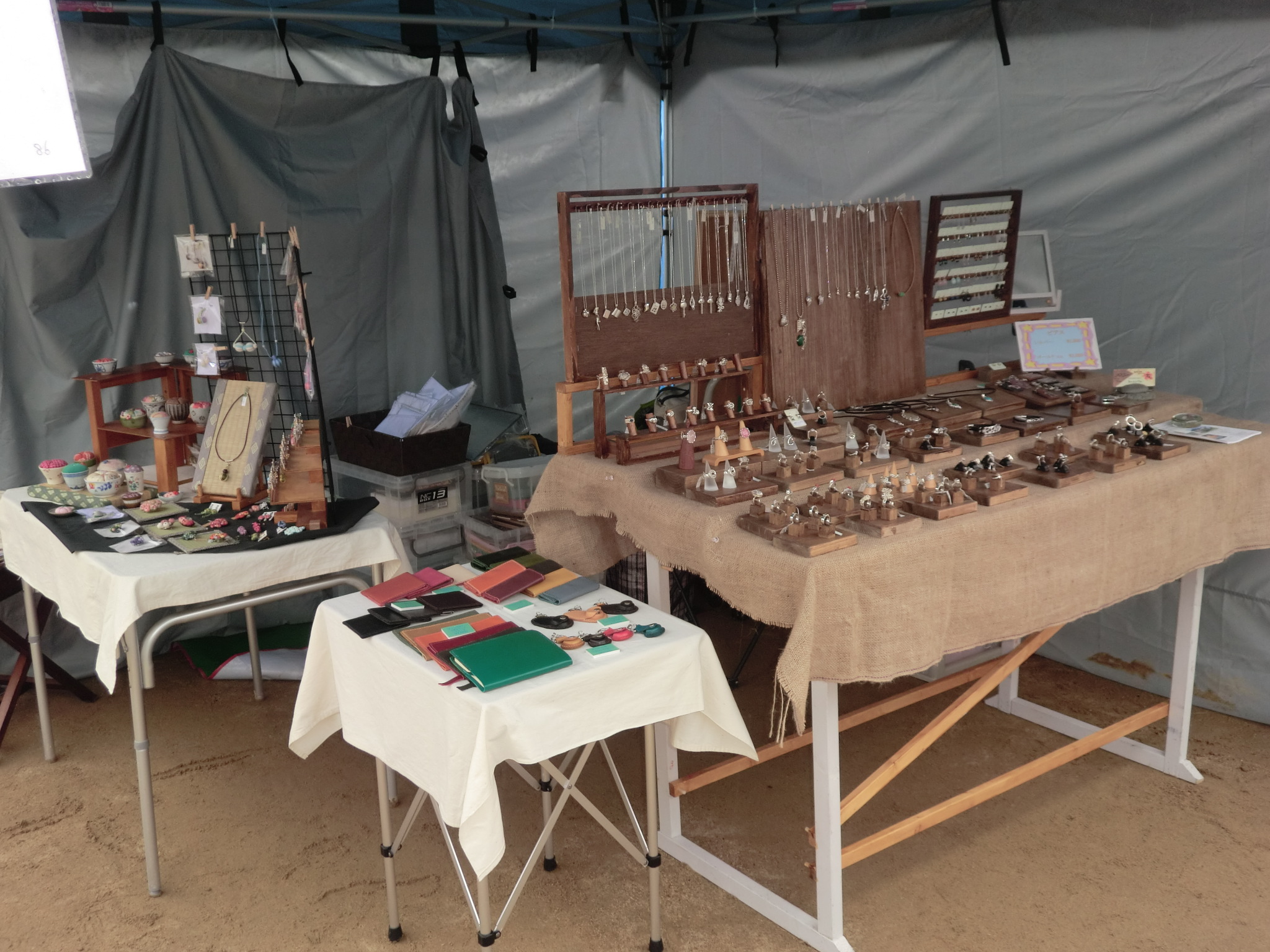第2回 2012京田辺 かぐや姫クラフト に出展してきました。 本当に二日間雨にたたられました。 現地に到着した時には雨は降っていませんでした。 ラッキー、早速タープを設営して雨が降ってきても中で作業が出来るようにしたとたんにもう降り出しました。 コンナ感じに並べてみました。 雨が振り込む方向には横幕を張っています。 そのかげんかどうしても中が暗くなってしまいます。 グランドは直ぐにこんな状態に、せっかく来て頂いたお客様も雨と気温の低さに ゆっくり各ブースを見ることもなく通り過ぎてゆきます。 しかし、その反面作家さん達とのの交流時間はたっぷり 顔見知りの作家さん、また初めてお会いした 革クラフトの Strowberry wild さん 石川のクラフトでもまたお会いできそうなので次の楽しみになりそうです。 また前からお会いしたかった ブリキや彰三 さん 色々教えて頂きありがとうございました。 短い時間で聞けなかったことも多く、次回には質問をもっと整理しておかなければと またまた、プチ反省。 二日目 天気予報は曇り、20㌫の降雨予報でしたがやはり朝から雨、 どのブースも雨対策のためどうしても開放感が 少なくなってしまいます。 晴れていたら、もっと華やかに見えるのに 残念 ! 変えてみました。 しかし雨の降り方で出したり、引っ込めたり もう、何とかして ! と色々雨にたたられましたが、この天候にもかかわらずご来場いただいたお客様 本当にありがとうございました。これに懲りずに来年もよろしくお願いします。 また運営に携わったスタッフの皆様、何の問題もなく出展できましたことありがとうございました。