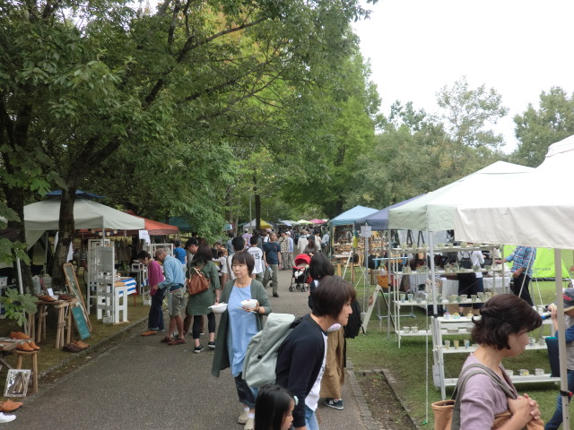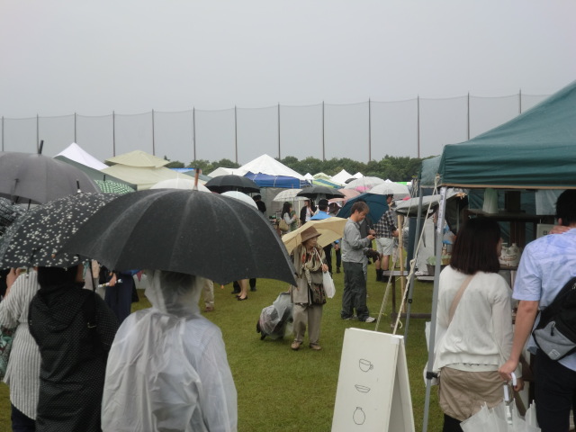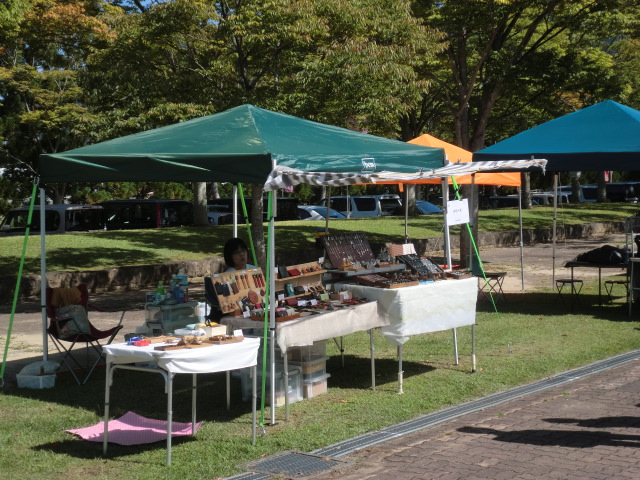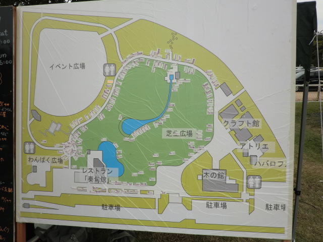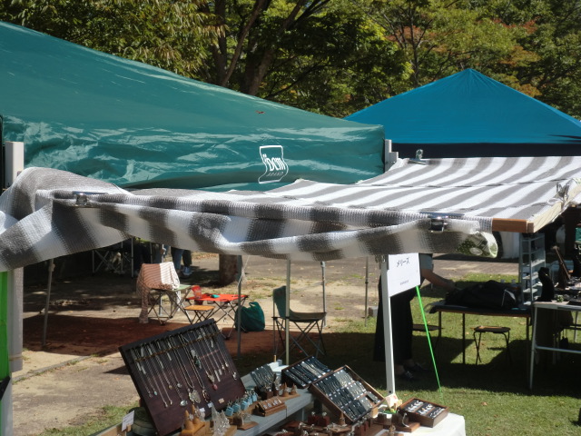 13:00からの搬入時間のためかなりの場所に多くのタープが設営されていました。 メリーズは去年と同じ場所の通路側に決めました。 去年と一味違うのは前に『ひさし』を付けられるようにしました。 これでお客様も暑くなくゆっくり見ていただけます。 会場はこんなレイアウトになっています。 外周の通路にそって出店したブースです。 森の中の通路にそってお店が並びます。 今年は通路部分のスペースが減ることになったため、去年に比べて中央の芝生 のスペースに出られる方が多くなりました。 天候も二日間を通じて晴れのち曇りと恵まれたため多くのお客さんが お店を回り色々な作品を見て回り買い物を楽しまれていました。