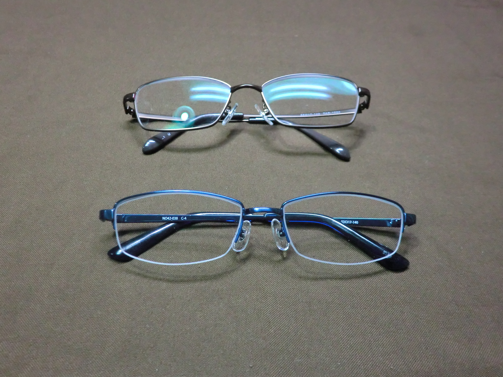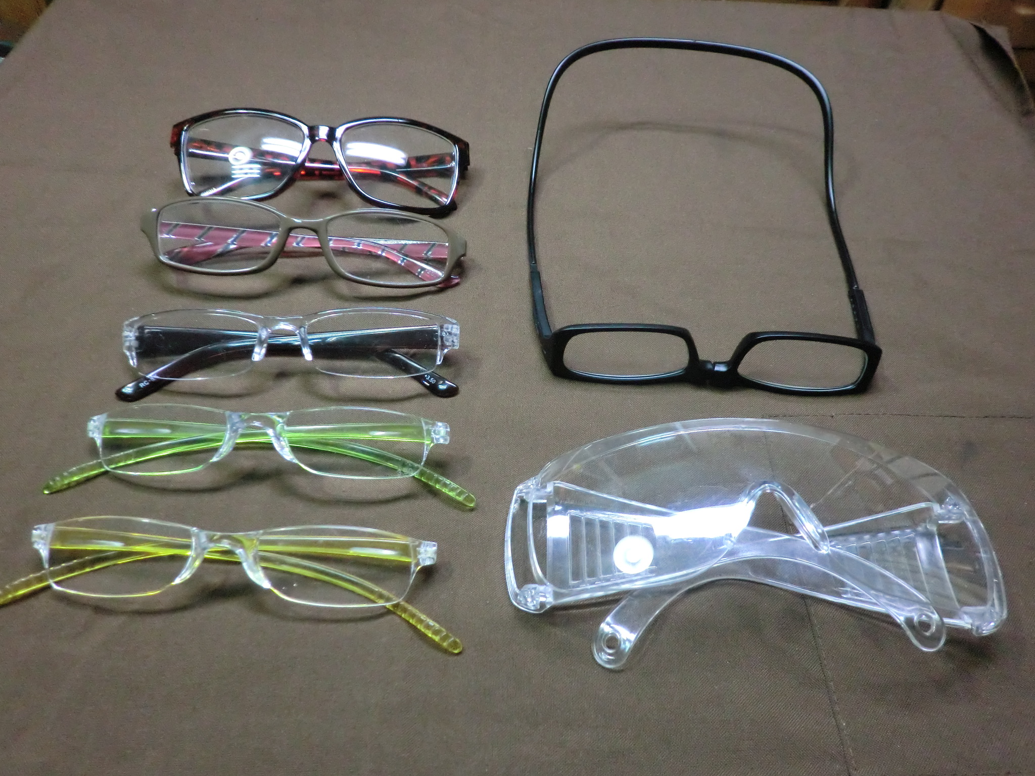 突然変なマスクみたいな画像ですが、実は目を保護するためのマスクです。 1月の16日に左目の白内障の手術を、そして一週間置いて右目の手術を受けました。 上のガードは術後二日間ほどつけさせられたものです。 白内障の手術は比較的短時間で終わり、その後は世の中が替わるほど 良く見えるようになりました。 しかし良いことも悪いこともあるので、遠くが見えるようになった代わりに 今まで裸眼で見えていた近くのものが全く見えずらくなってしまいました。 この後、術後の視力が安定するまでの間(特に仕事上使う近いものを見る視力) 特に仕事をするとき作業物をしっかり見るためすごく苦労しました。 これが始まりで、以下の如くメガネを買うことになってしましました。 右の一番下の透明なのは防塵から目を守るための保護用で、左の一番上は 外歩きの時の度のない透明なサングラスで風とホコリ除けに買いました。 あとは全て倍率の異なる1.5倍から3.5倍までのいわゆる老眼鏡です。 殆ど100均のものですが。 視力は1.0ぐらいになっていたので部屋の中や外出時は問題はなかったのですが、 細かいものを見るときは毎日見える距離が変わるので、その後1か月ぐらいは とても苦労をしました。 3月に入り視力もあまり変動しなくなったので眼科で処方箋をもらい きちんとしたメガネをあつらえました。 上の眼鏡は10㎝~15㎝の近くを見るための仕事用専用です。 下の眼鏡は中距離~遠距離用で度は入れていません。 ただし乱視の為遠距離になるとピントがぼけるためその矯正の為です。 矯正後は1.2ぐらいの視力まで上がって 夜間でも運転中遠くの看板でもしっかり読めるようになりました。 これならイベント参加のための夜間ドライブも何とかできそうです。 でもあんまり夜は運転はしたくないですが。