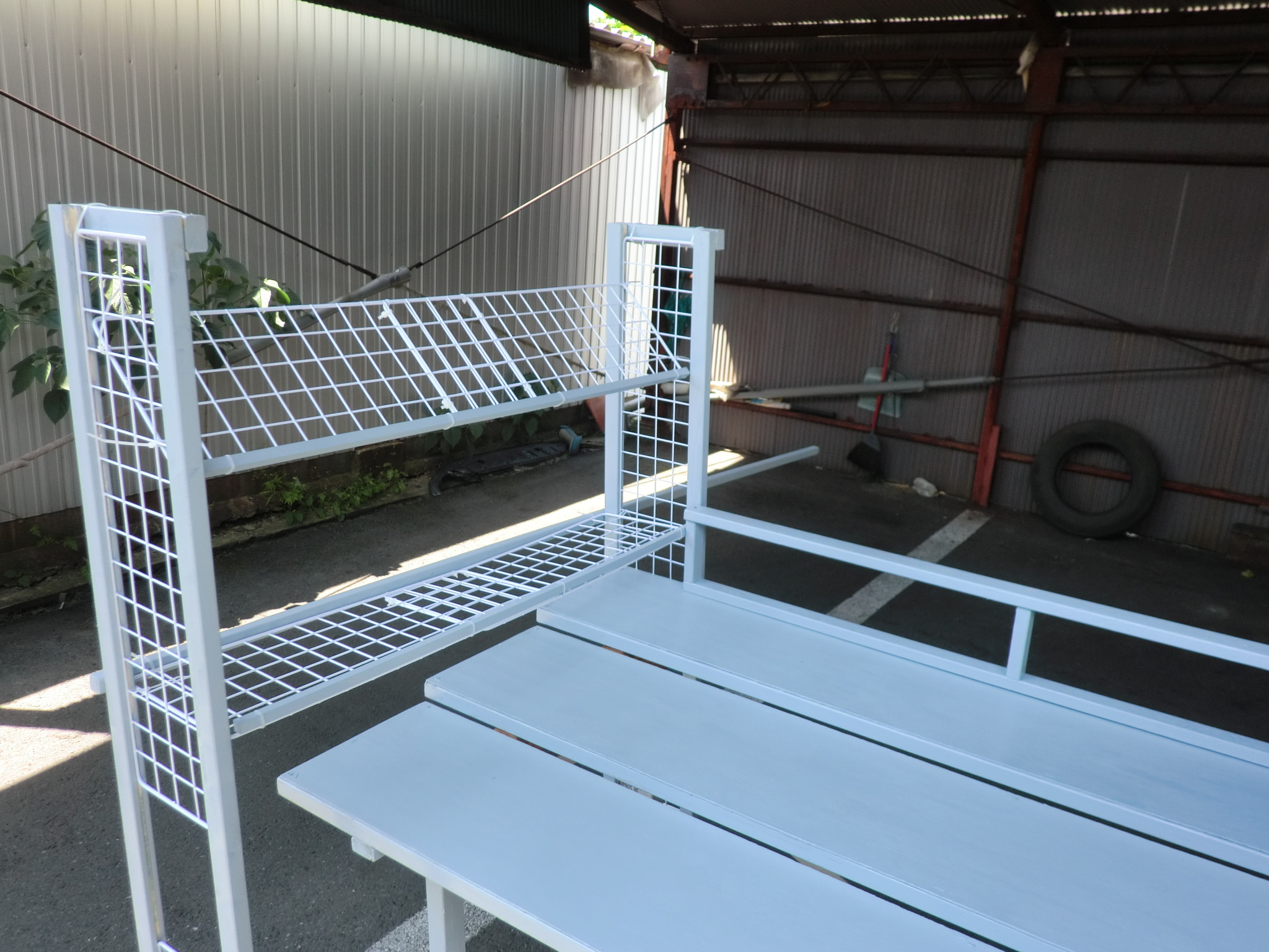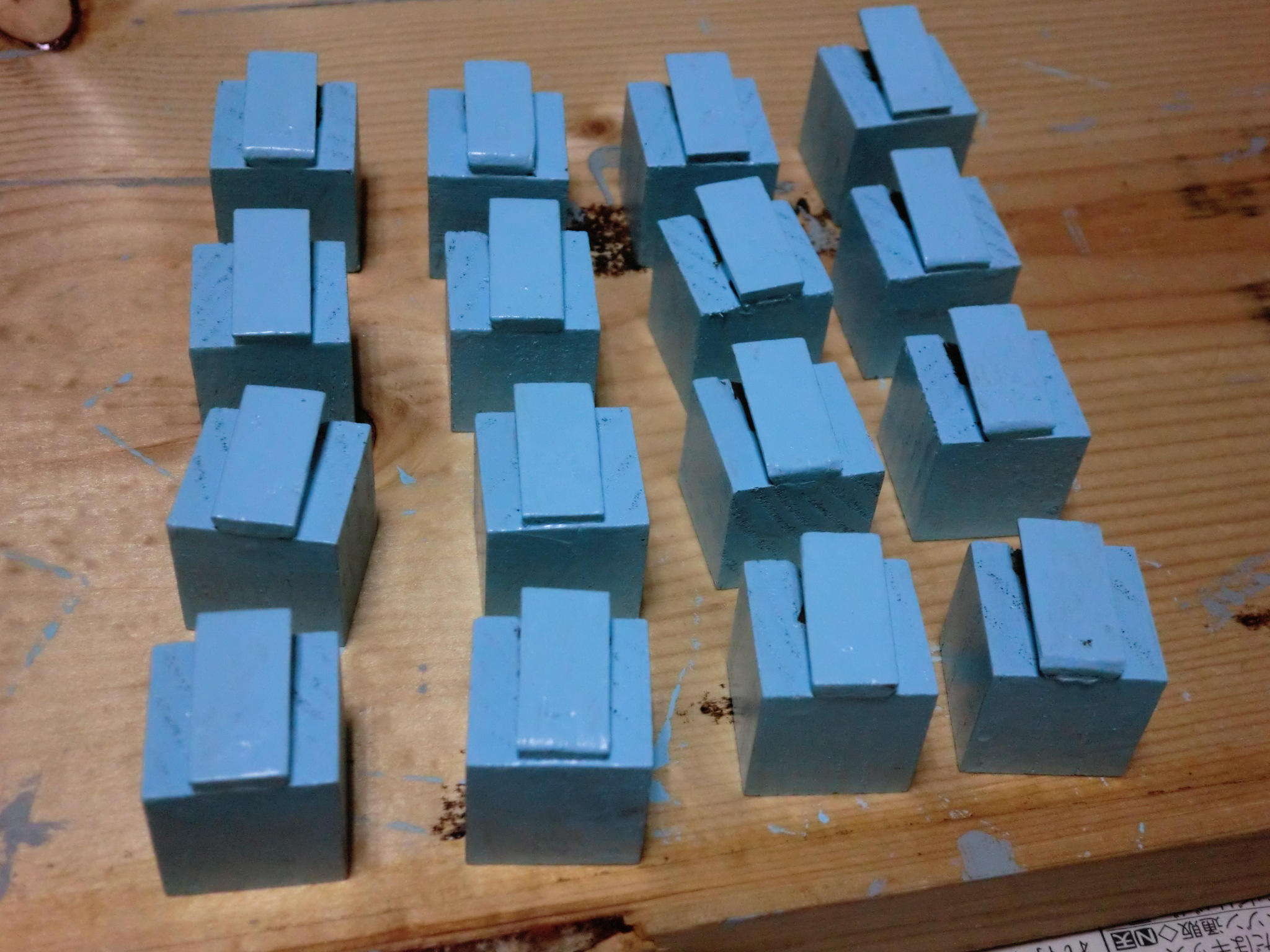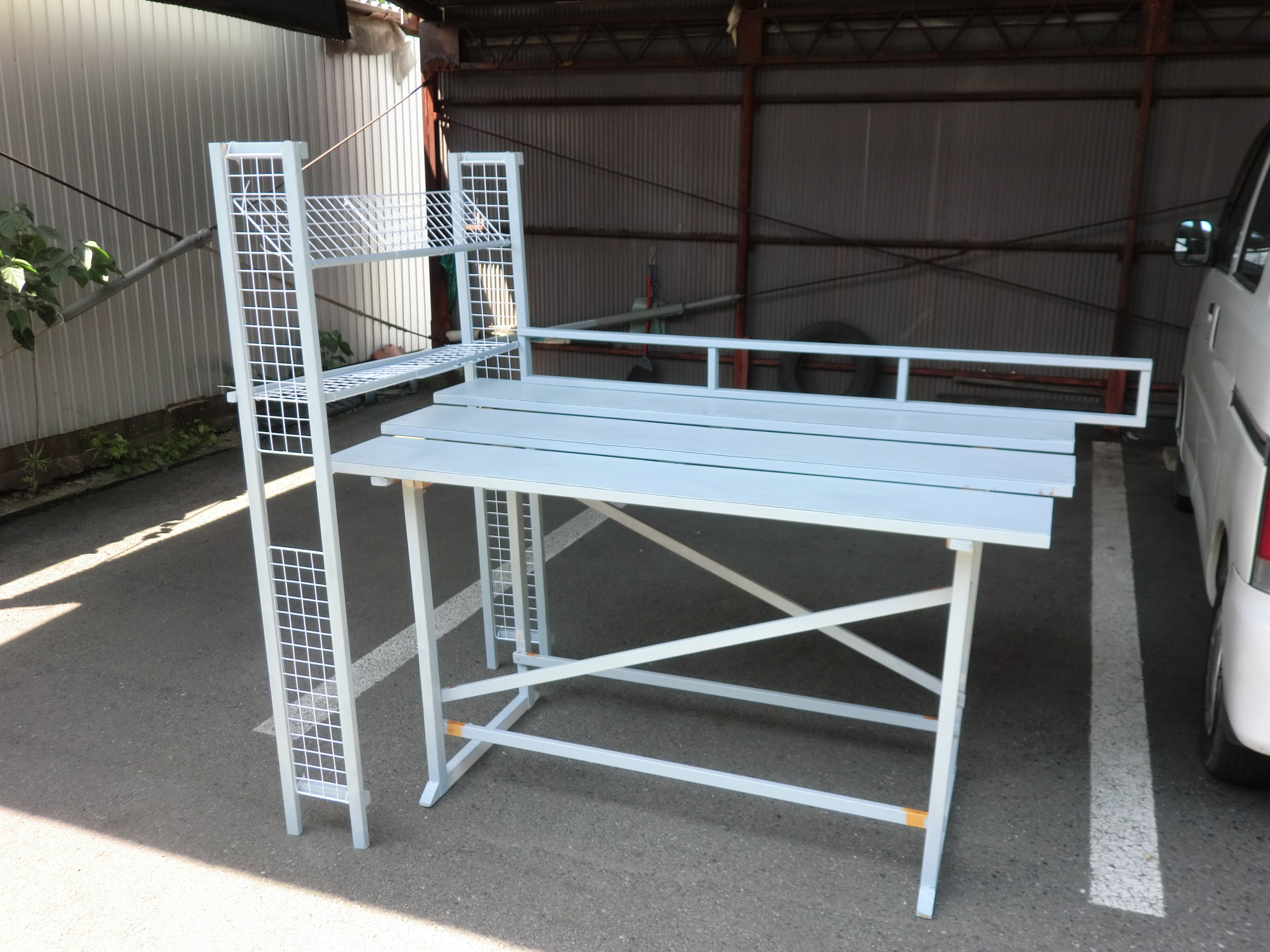 しなくてはいけないことはタップリあるのに体 が拒否反応をおこしています。『 で、2週間グダグダしていました。 』 というととんでもないことになってしまうので どうしてもはずせないこと 納品、打ち合わせ、などはスケジュールにしたがって こなし、あとはすこし楽しいことを優先的にしました。 クリマ用の展示台のオプションを作ると前に書きましたが、この際全面的に 展示台の色を含めて変更することにしました。 2m×2mのブースではどうしても前面に展示する面積が限られてしまいます。 そこで展示台の左側面に壁面展示できるような棚をつけました。 この壁面はおもにワイヤーラティスで構成しているので、棚の増減や変更は 現場においても自由自在です。また連結は結束バンドを使用しているため 組み立て、バラシも簡単に出来、軽く出来上がりました。 この棚には革を並べようと思っています。 この変な集団はリングを立てる台です。 今まで全体はオールナットの茶を主体にした色調で塗装していましたが、 銀の作品の色、輝きが今ひとつさえないことが気になっていました。 そこで基本になる指輪の展示台を明るいブルーに変更して、その色を際立たせるよう ベースになる展示台、ステージ、ブロックなどはブルーグレーに変更し全て塗り替えました。 お披露目はどこにしようか考えています。 針を刺す部分がすこしへたれてきたので 奥さんに頼んで作り変えてもらいました。 前より明るくて気に入っています。 この針山のシリーズは 『花』 の作品として奥さんが作っています。