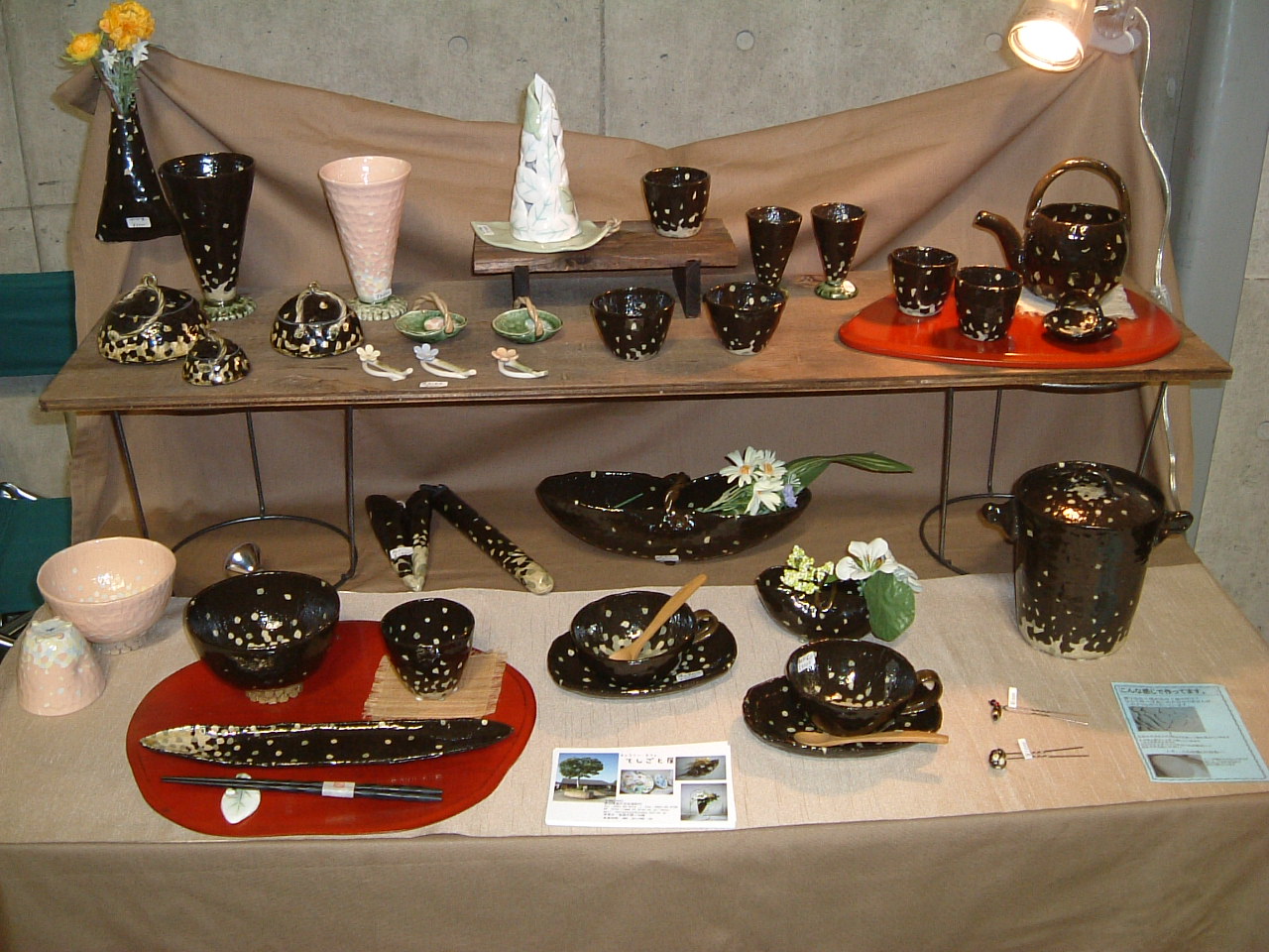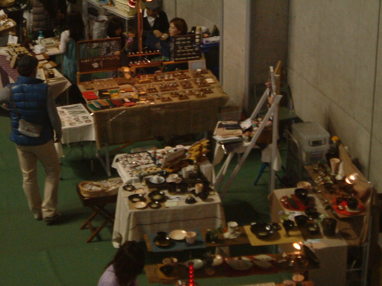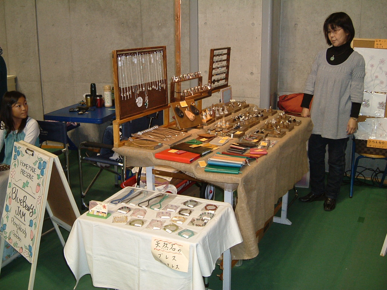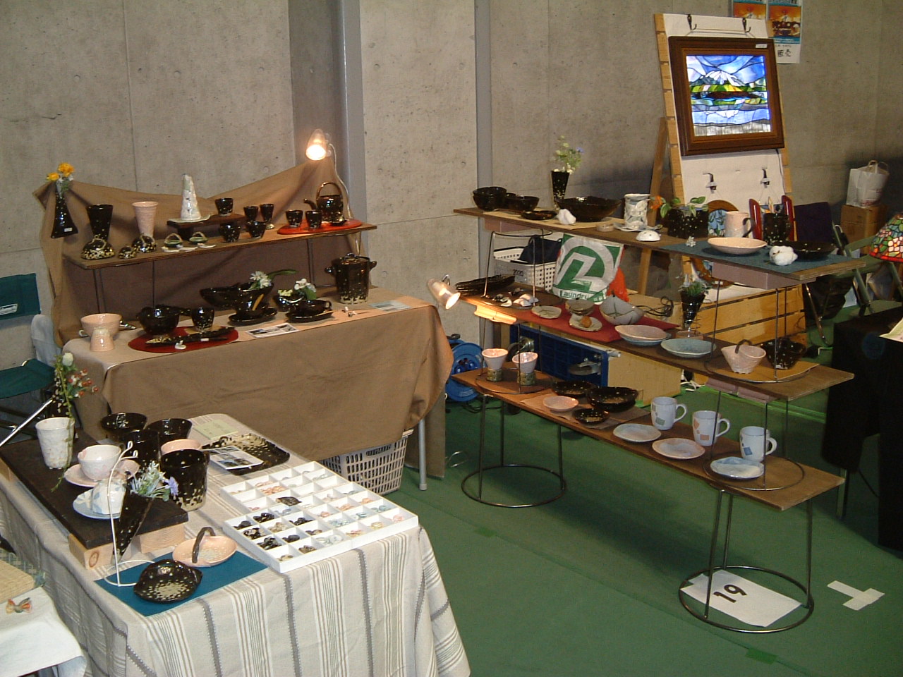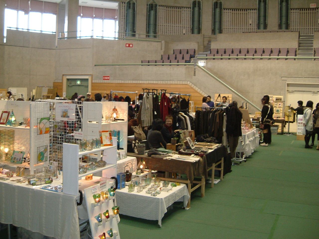 イガデハク 今回伊賀のイガデハクに初めて出展しました。 岐阜から2時間30分かかって会場に到着。雨の予報どうり小雨が降っていました。 でも今回は県立ゆめドームうえの 、屋内です。タープもいらないんです。 昨日の金曜日から開催しているので会場には展示が済んでいるブースが3分の1ぐらい ありました。 会場内には約85ぐらいのブースが設営されるので、一軒当たりは2.2m四方であまり広くはありません。 また角地でもないため、今回は縦に二の字に展示台を据えてお客様にはポケットの中に入って 見ていただくようにしました。 上から見るとこんな感じに展示台を配置しました。また通路側には革の作品を並べ お客さんの目を引くようにしてみました。 そして2代目広報担当は情報収集のためブース内にいることはほとんどありません。 会場内はこんな雰囲気です。時間が早いのでお客さんは少し少なめです。 全体が活気付いてきました。 会場の2階からの写真でいつもの他の会場風景と ちょっと違った感じがします。 会場内を歩き回って、愛嬌を振りまいて くれていました。 今回のお隣さんは Plants Woody & Garden の林さん 庭師のご主人と二人のお嬢さんの応援での参加です。 ブルーベリーとルバーブのジャムを作っていらっしゃいます。 ・・・もちろん無農薬 無添加です 詳しい説明は左の説明を 読んでね。 お嬢さんも試食を進めたり お客さんへの呼びかけと がんばっていました。 ルバーブのジャムを買いました。 反対側は 陶器を作っていらっしゃる愛知県瀬戸市の安藤さん 他の陶器を作っていらっしゃる方とは、少しテーストが異なってモダンな感じがします。 よりオブジェ等のほうが好きだと言ってらっしゃいました。 その他の作品は瀬戸市赤津町の 『 ギャラリーカフェ てしごと屋 』 のほうで 展示してあるそうです。 上の葉のモチーフの香炉立てはわたしもとっても気に入りました。 もう少し書くことがあるんですが、眠いので今日はこの辺で、 明日もう少し続きを書きます。 おやすみなさい............ PR