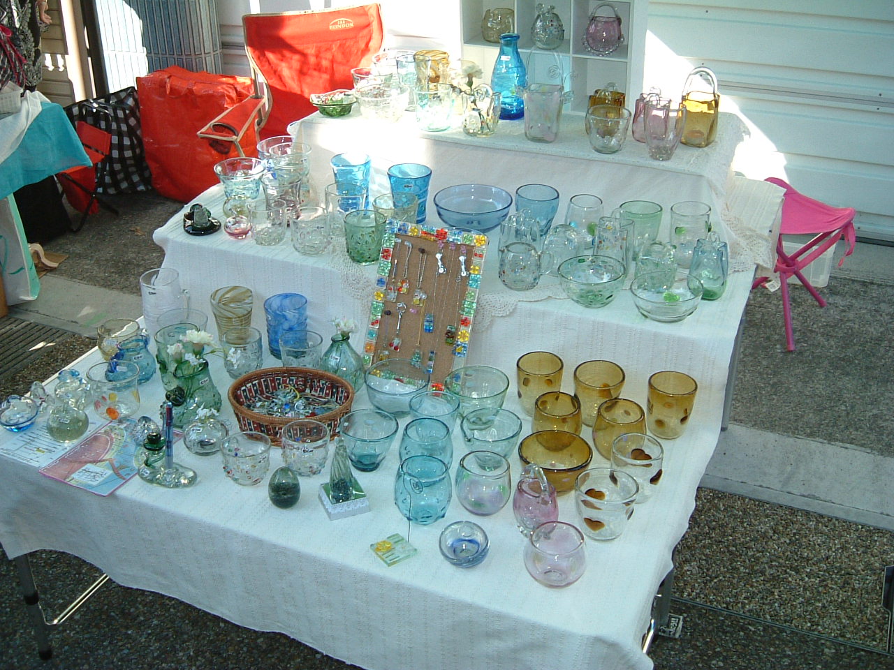 × [PR]上記の広告は3ヶ月以上新規記事投稿のないブログに表示されています。新しい記事を書く事で広告が消えます。 第15回 おもしろそうだがや 犬山クラフトフェアー に出展してきました。 タイトルどおり実行委員会の皆様がおもしろく盛り上げてくれる 本当に楽しいクラフトフェアーです。 また魚屋町の住民のみなさまも非常に協力的です。 岐阜から近いこともあって、GIFUクラフトフェアーと並んで はずせないクラフトフェアーの一つで、今回の出展も楽しみにしていました。 雨の予報がずれて、いいお天気になってくれました。 去年は北向きのブースで寒くて寒くて、南向きのブースの人たちの 暖かそうな様子がうらやましくて仕方がなかったのが、 今回は南向きのブースで、午前中は、太陽の暖かさを充分満喫していましたが 午後からは風が吹き始めてちょっと肌寒さを感じ上に一枚余分に羽織ることになりました。 並んでいます。 けっこうな人出もありました。 今回はブースサイズの関係から2m×2mのタープ を使いました。 サイドにスペースがあったので、エル字型の配列の 展示です。 やはり少し小さく感じますね。 ほら貝のパフォーマンス。 右は ご存知 先の副将軍 水戸の黄門さま 他にも別の鎧武者やら、三度笠姿の旅人さん などがおもしろそうだがやと参加してくれました。 今回のお隣さんは マキミチ工房の渡辺 みちるさんです。 陶器と陶器の土笛を作っていらっしゃる若いお嬢さんです。 オカリナとは少し形が違う土笛ですが音色は澄んだきれいな音が 出ます。 時々はにかみながら演奏も披露していました。 次の作家さんはお隣ではなかったんですが、一昨年、昨年と 自分が気にいっていろんなガラスの作品を求めました。 ことしもまた、一つ買ってしまったのでここで紹介させていただきました。 リサイクルガラスを使って作品を作っている近藤 美佐恵さん 型にはまったきちっとしたものでなく、どこかほのぼのとした 温かみがあるガラスを制作されています。 なぜか用途は自分で考えてください、というような感じがして タンブラーをキャンドルスタンドにしたりして、 自分j勝手な使い方で楽しんでいます。 犬山 魚屋町の皆さん、実行委員会の皆さん、今回も楽しく過ごさせていただき 有難うございました。 来年もよろしくお願いします。 PR ● コメントフォーム |