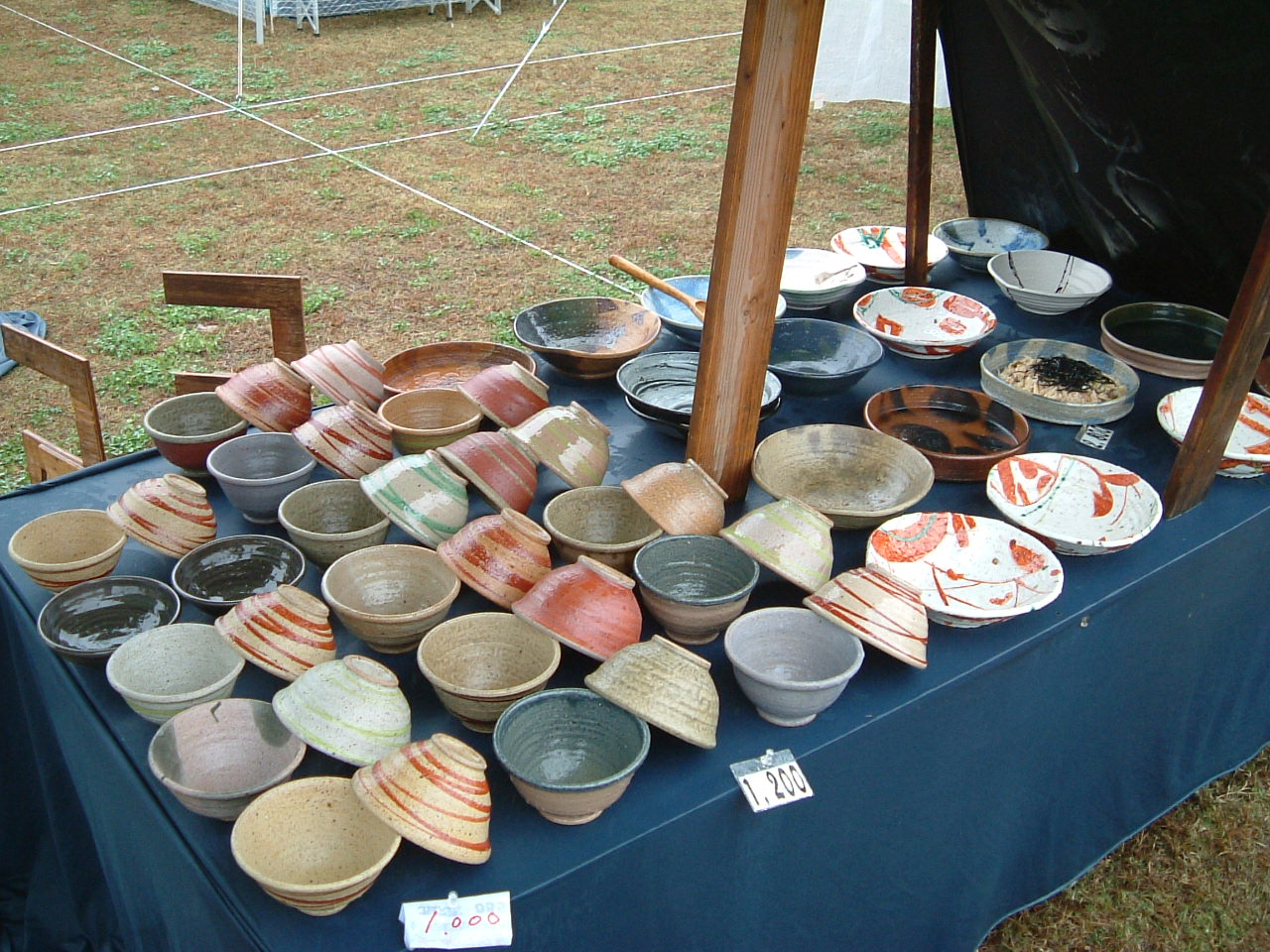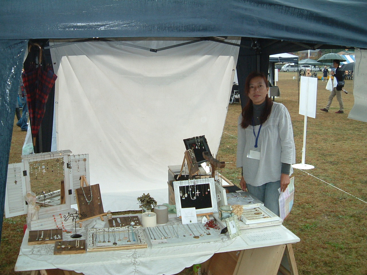 ラグーナ蒲郡に七時半ごろに到着、天気予報は曇り、 出展準備中のタープなどの設営が終わるまでは雨が降って欲しくないなー、!! 気持ちが天に通じたのか一日目は雨も降ることなく準備が出来ました。 今回はブースのスペースが3.6m×5.4mと広くまた 実演もあるため、タープをふた張り、設え画像の右側に 実演コーナー、左側に作品展示をしました。 お昼前にはフードコートの前にはこの人だかりです。 フェアー会場を見回しても、広い会場全体に多くのお客様が いらしていました。 二日目 夜半の雨が朝まで残り、天気緒予報も一日雨模様との予報。 朝8時の会場もこんな様子です。 開場後も地面はぬかるみ、ご来場のお客様には たいへん不便をおかけしてしまいました。 しかしお昼近くには雨も止んで、午後には また多くのお客様がいらしゃっていただけました。 今回のお隣さんは休んで、ぜひ紹介しいたい作家さんブースをお知らせします。 ≪ 銀の道 ≫の前に出展された 現窯(うつつがま)の内崎徹さん 岐阜県恵那市串原から陶磁器での出展です。 朱の色の色味が岐阜県の陶芸作家の方と少し違っていたので お話を伺ってみました。 石川県で九谷焼を修行され地元に帰って窯を開かれたそうです。 下の画像が内崎さんの作品です。 午前中まだ雨が降っていたときに撮った画像のため少し暗くて ゴメンナサイ。 もう一人は岡崎クリエーターズフェスタで背中合わせでご一緒だった アンティークボタンキコの パイクゆきこさん 奈良からの参加です。 アンティークのボタンや、ガラスを使ってアクセサリーを制作されています。
